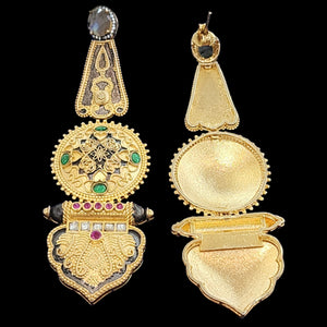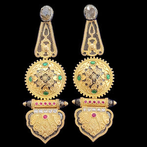 These Antique Gold Long Earrings feature intricate craftsmanship with a beautiful mix of traditional design elements. The earrings showcase a central round motif with green enamel and detailed gold work, radiating an elegant vintage charm. The top of the earrings is highlighted by a polished stone setting, completing the regal aesthetic. Perfect for adding a touch of heritage style to any festive occasion.