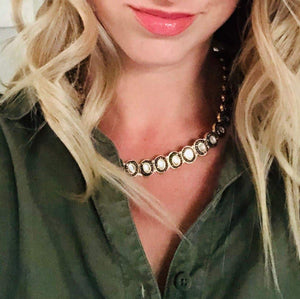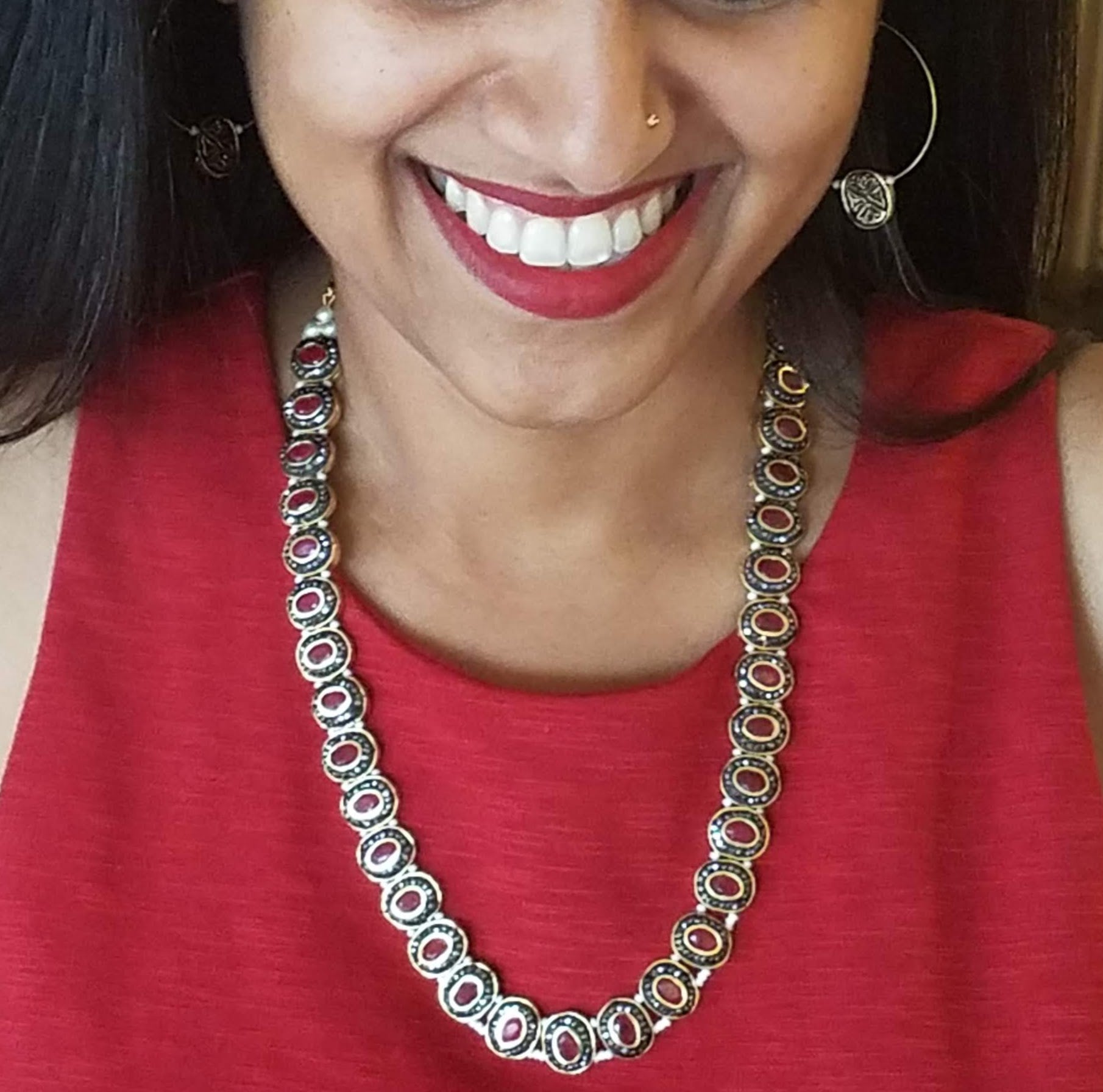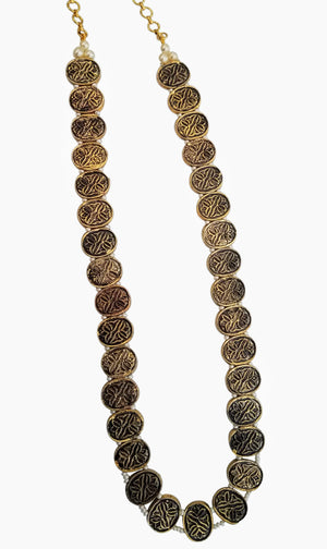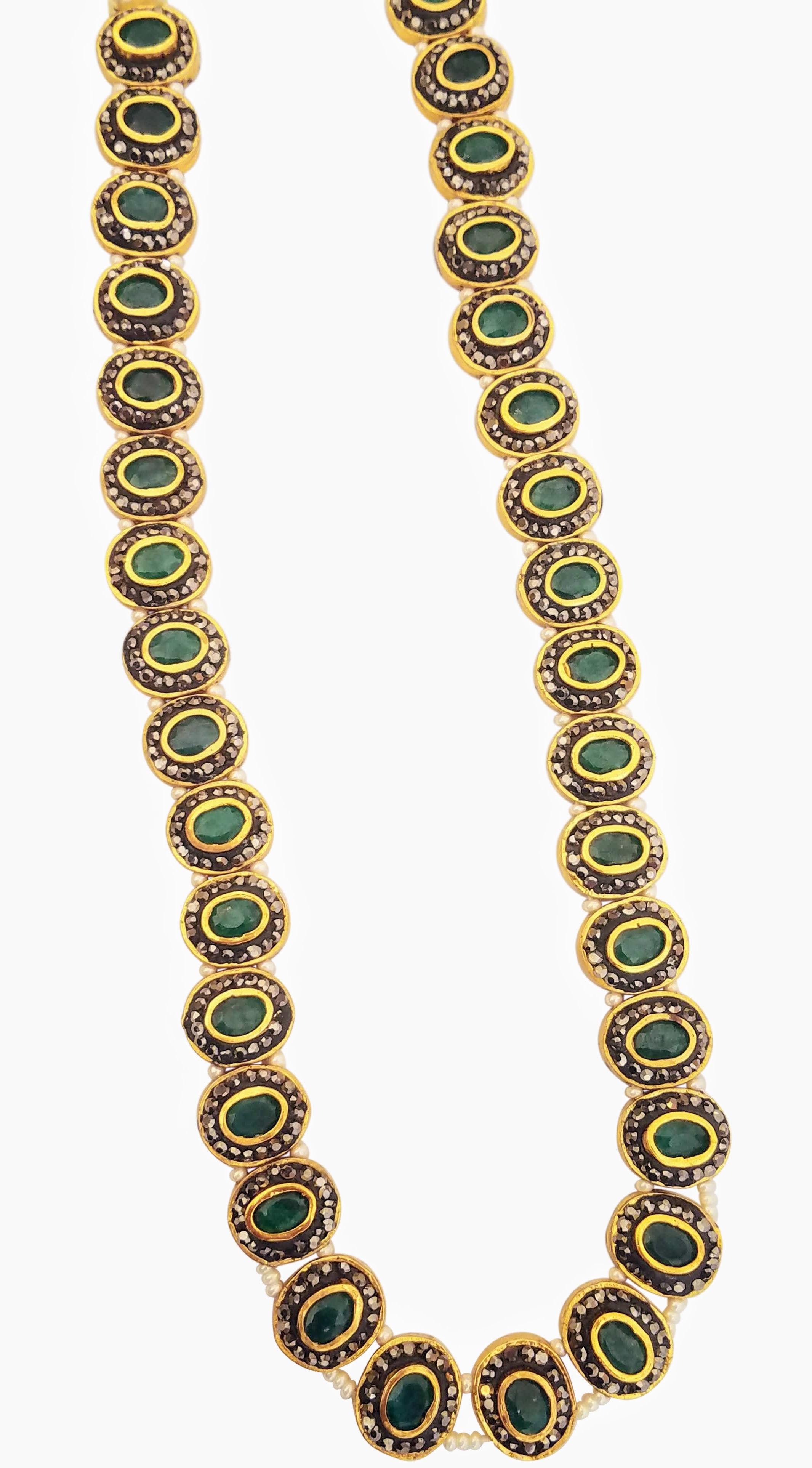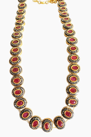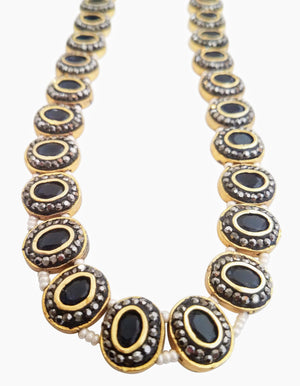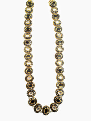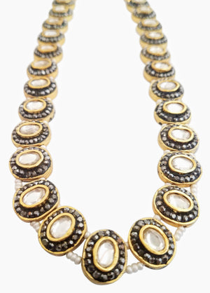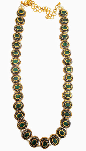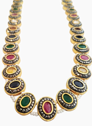 Set beautifully amidst gold plated circles, each of the nine precious gemstones in this necklace is surrounded by marcasites (the black-colored stones) and strung to each other via pearls to bring you a piece of jewelry that showcases a unique design. The antique finish of this piece heightens the drama and the oomph quotient. If you’ve always dreamt of owning a piece of navaratna jewelry, which is considered as a symbol of royalty and power, bring home this stunning piece. Pair it up with your simple and minimalist everyday wear to add a dash of style, show it off as part of your wedding jewelry, or layer it up with your birthstones – there are different ways to flaunt your precious purchase.