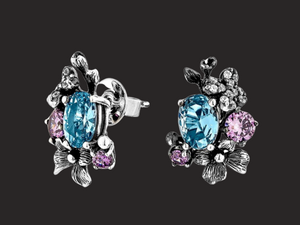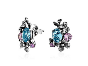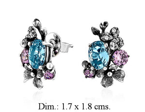 These elegant sterling silver stud earrings feature a beautiful floral design adorned with sparkling blue topaz and pink sapphire gemstones, accented with clear crystals. A unique and eye-catching design that adds a touch of natural beauty and sophistication to any occasion.