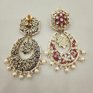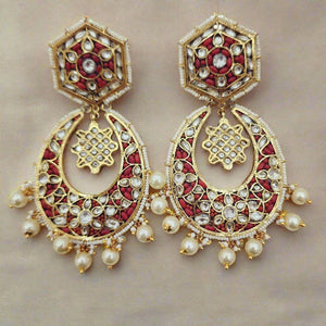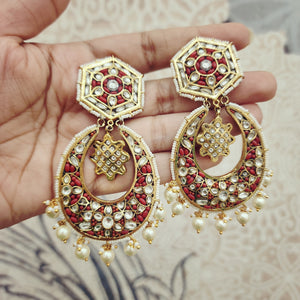 Beautiful gold foil Coral & Flower Kundan Chandbali earrings with delicate pearl drops. The intricate design showcases a blend of rich coral stones and classic Kundan work, making these earrings a perfect addition to any traditional ensemble.