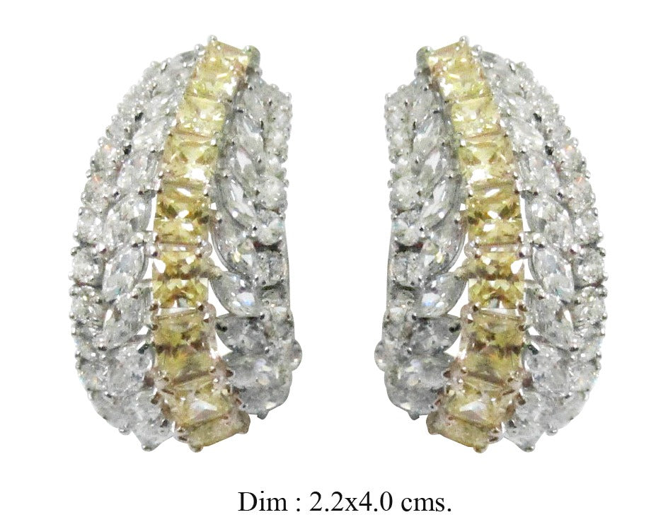 Make a bold and stylish statement with these curved white and cannary CZ cluster earrings. Featuring a unique half-hoop design adorned with a dazzling arrangement of both white and cannary cubic zirconia stones, these earrings offer exceptional sparkle and modern elegance.