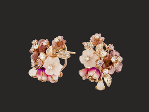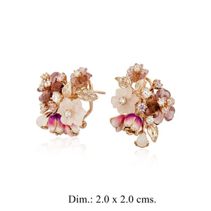 These enchanting dusky bloom floral cluster earrings feature a beautiful arrangement of enamel flowers in soft shades of pink and purple, accented with sparkling crystals on a rose gold-toned stud. A unique and elegant design that brings a touch of romantic beauty to any occasion.