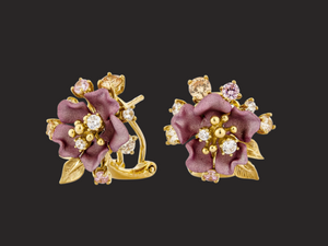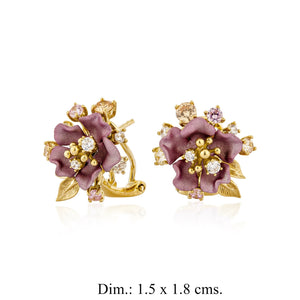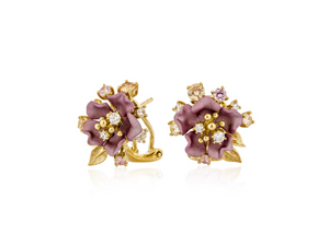 These elegant dusky purple floral cluster earrings feature beautifully enameled flowers in a muted purple hue, accented with sparkling crystals in various pastel shades, on a warm gold-tone stud. A unique and sophisticated design that captures the subtle beauty of a blooming flower.