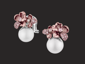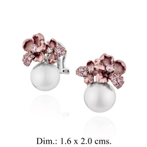 These elegant dusky rose pearl stud earrings feature stylized metallic rose flowers with sparkling pink crystal accents, cradling a luminous pearl. A unique and sophisticated design that adds a touch of floral beauty to any occasion.