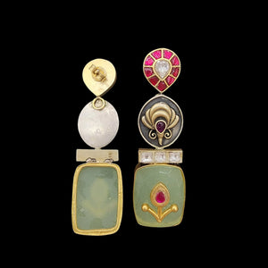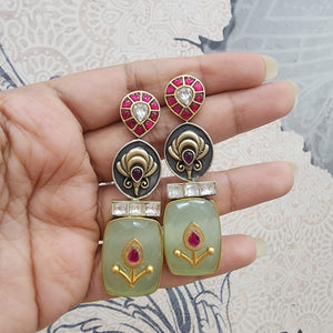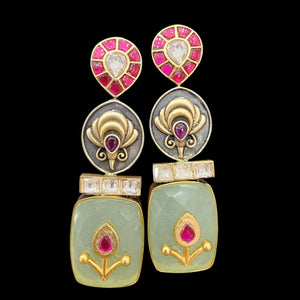 These stunning Fusion Prehnite Earrings feature an upper design of kundan stones surrounded by red kundans. The middle showcases a fusion lotus with a central kundan stone, while the bottom is adorned with prehnite and additional kundan accents. Perfect for adding a pop of color to traditional attire.