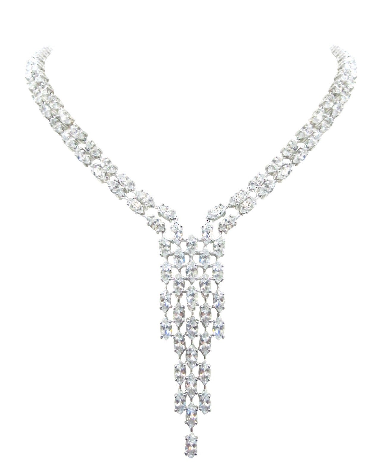Turn heads with this cascading crystal statement necklace, designed to add instant glamour to any look. With its dazzling arrangement of rhinestones in a waterfall silhouette, this piece is perfect for brides, party wear, or special evenings out.