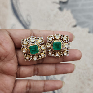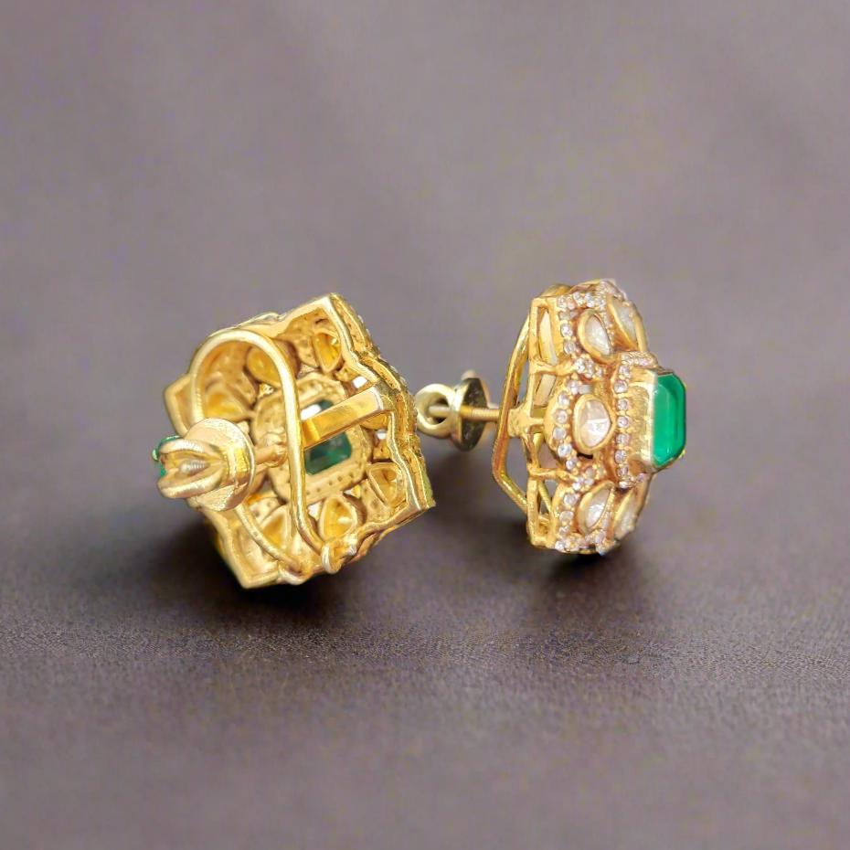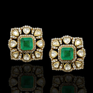 Make a bold statement with our Emerald Square Polki Studs. These earrings feature a central square-cut emerald, beautifully surrounded by uncut moissanite polkis in an intricate gold setting. Perfect for special occasions, these studs blend traditional elegance with timeless sophistication. Ideal for those seeking large polki earrings or statement emerald jewelry, these studs are a dazzling addition to any collection.