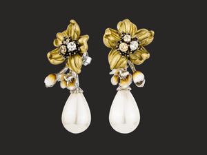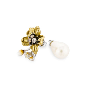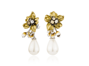 These elegant golden bloom pearl drop earrings feature stylized metallic gold flowers with sparkling crystal centers, suspending a luminous ivory pearl. A unique and sophisticated design that adds a touch of floral beauty to any occasion.