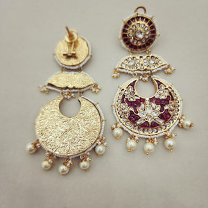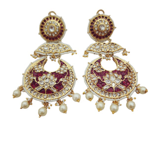 Adorn your ears with the timeless elegance of Kundan & Ruby Chandbali Earrings. Crafted with kundan work, these gold foil earrings feature a beautiful blend of rubies and pearls, creating a stunning crescent design that adds a touch of royalty to any ensemble. Perfect for weddings and special occasions.