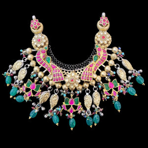 A Fusion pendant with intricate floral kundan designs, highlighted by two majestic peacocks on each side. Adorned with gold ball detailing along the bottom, the pendant features pink and green kundan lotus motifs and elegant blue bead drops. A perfect blend of tradition and modern artistry, this two-hook pendant adds a regal touch to any look.