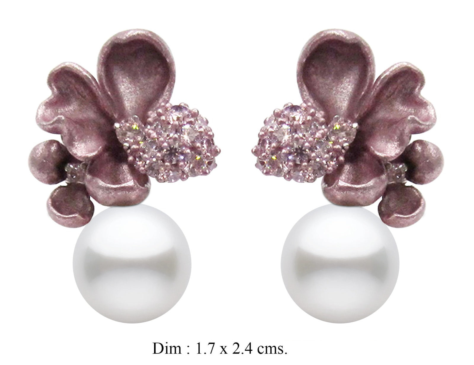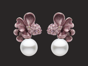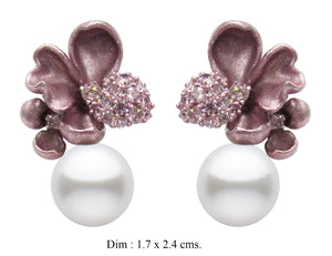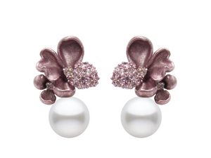 These elegant mauve blossom pearl drop earrings feature stylized metallic mauve flowers with a sparkling crystal cluster at the center, suspending a luminous pearl. A unique and sophisticated design that adds a touch of floral beauty to any occasion.