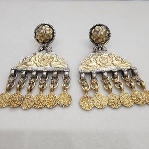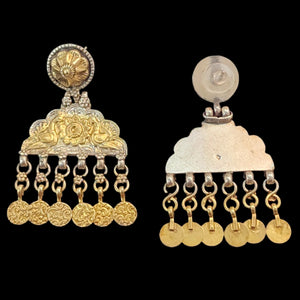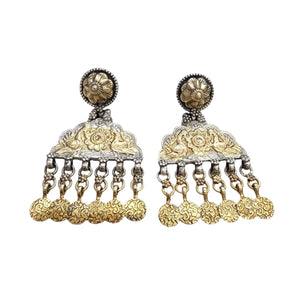 These earrings feature a blend of oxidized silver and gold accents. The round top is engraved with a floral design, connected to a Crescent shaped center adorned with floral details. Six gold-tone discs hang from the base, each etched with intricate patterns. A versatile choice for adding a unique touch to your collection.