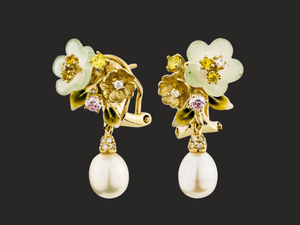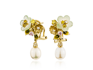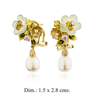 These charming spring blossom pearl drop earrings feature a delicate cluster of enameled flowers in soft green and yellow hues, accented with sparkling crystals, atop a gold-toned stud with a graceful dangling pearl. A unique and elegant design that brings a touch of springtime beauty to any outfit.