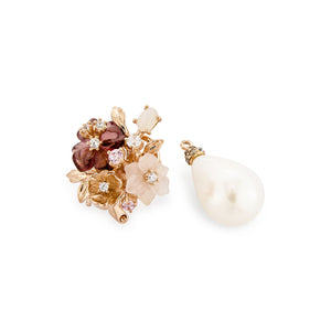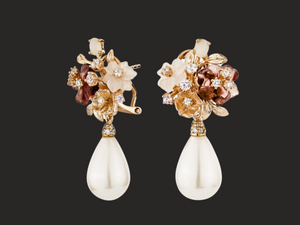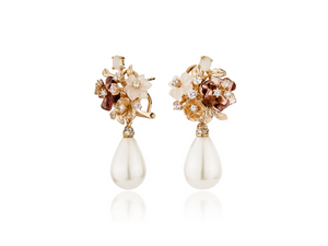 These elegant autumn bloom pearl drop earrings feature a rich cluster of enamel flowers in warm burgundy and ivory hues, accented with sparkling crystals, atop a rose gold-toned stud with a graceful dangling pearl. A unique and sophisticated design that captures the beauty of the fall season. The dimensions are 1.8 x 3.5 cms.