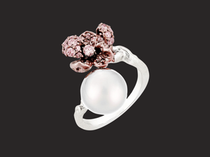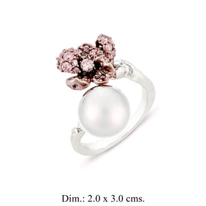 This captivating pink crystal blossom pearl ring features a stylized metallic rose flower design fully encrusted with sparkling pink crystals, cradling a luminous pearl. A unique and eye-catching statement piece that adds a touch of glamour and floral beauty to any occasion.