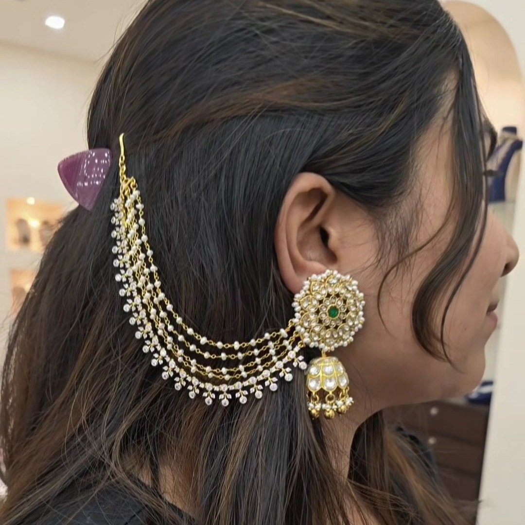 These elegant earrings feature a floral design with white kundan stones arranged around a central green stone. The upper floral motif is surrounded by delicate pearls, while the jhumka below showcases a white kundan dome adorned with gold accents and pearl clusters, creating a traditional yet luxurious look. Perfect for special occasions.