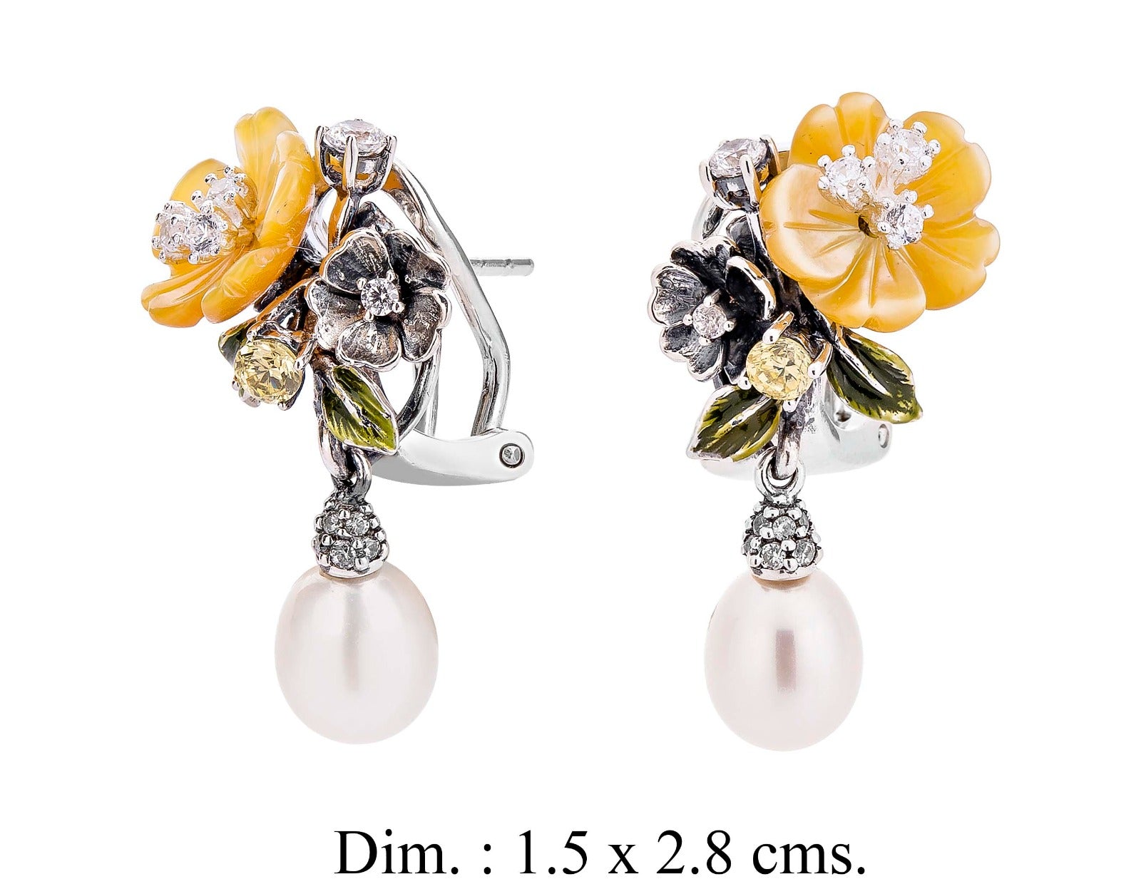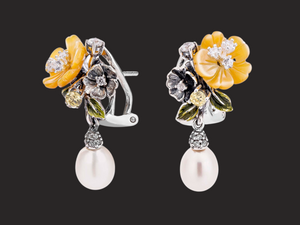 These exquisite floral pearl drop earrings feature beautifully enameled flowers in vibrant hues accented with sparkling crystals and a delicate dangling pearl. A unique and elegant statement piece perfect for adding a touch of nature-inspired charm to any occasion.