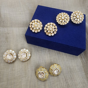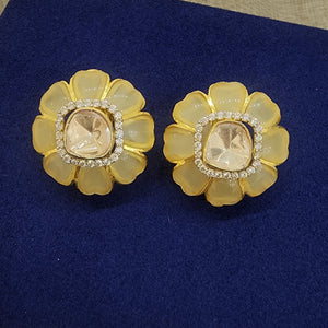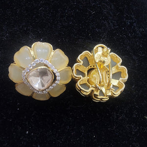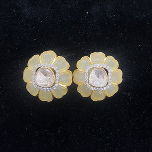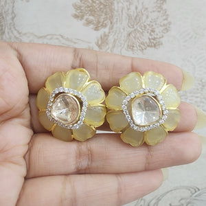 These yellow mother of pearl flower-shaped stud earrings showcase a radiant polki diamond at the center, surrounded by luminous petals of yellow mother-of-pearl. Delicate CZ stones enhance the design, adding a touch of sparkle to these beautiful studs. Ideal for festive and formal occasions, these earrings exude grace and charm, offering a warm, luxurious glow that complements a wide variety of outfits. A perfect blend of traditional craftsmanship and modern design.